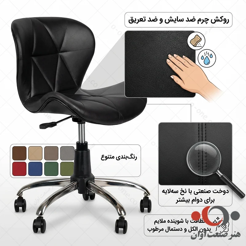روکش چرمی این مدل از نوع ضد سایش و ضد تعریق است و در رنگبندی متنوع قابل سفارش میباشد تا بتوانید آن را بهراحتی با فضای خود ست کنید. دوخت صنعتی با نخ سهلایه نیز باعث افزایش دوام روکش و جلوگیری از باز شدن درزها در طول زمان شده است.